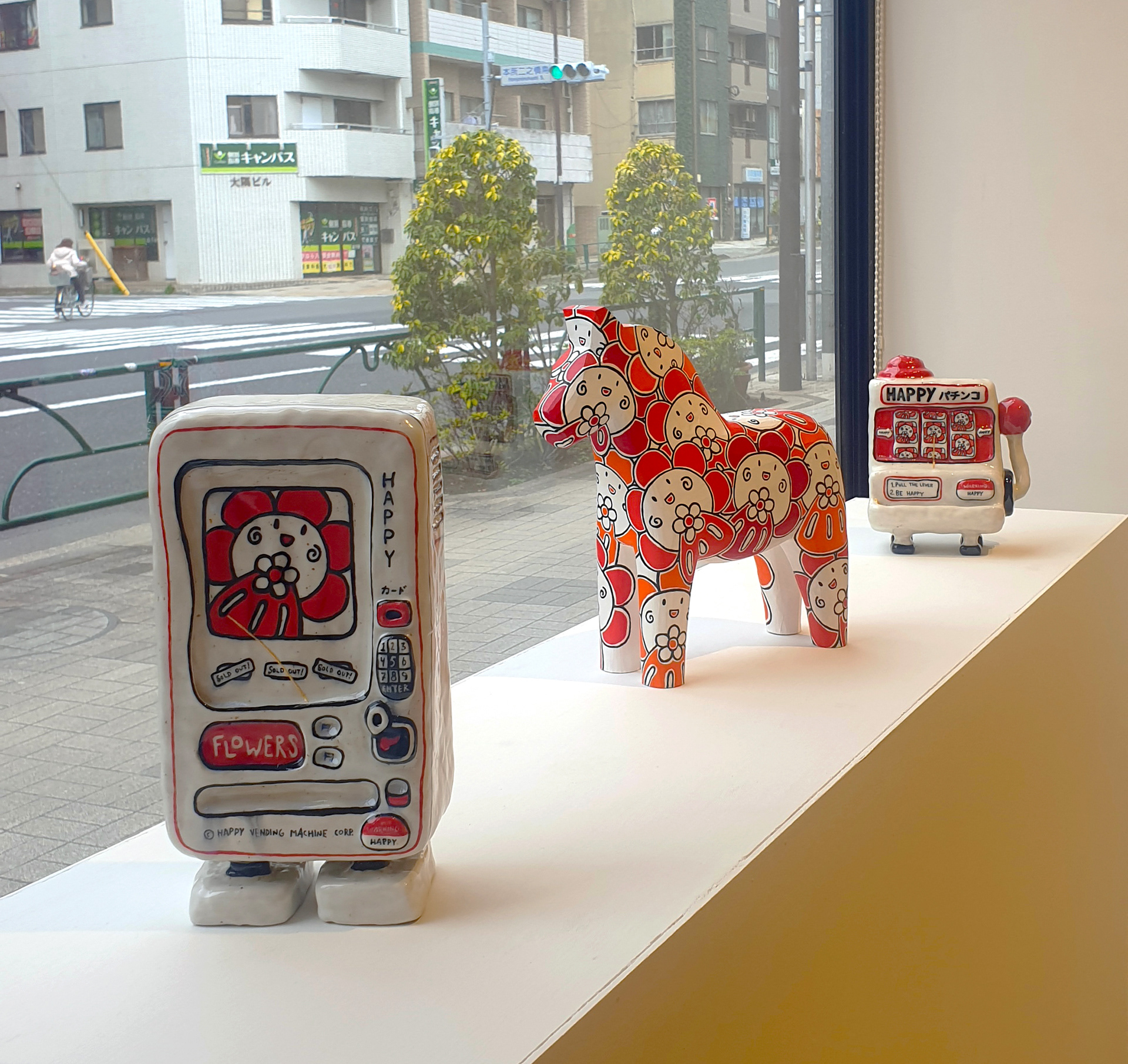 Happyでもつかれた (Happy, but tired) was my second exhibition in Tokyo Japan. It took place in March 2025 at Gallery Dalston. A selection of works on vinyl tarp, ceramics and originals on paper was on display.